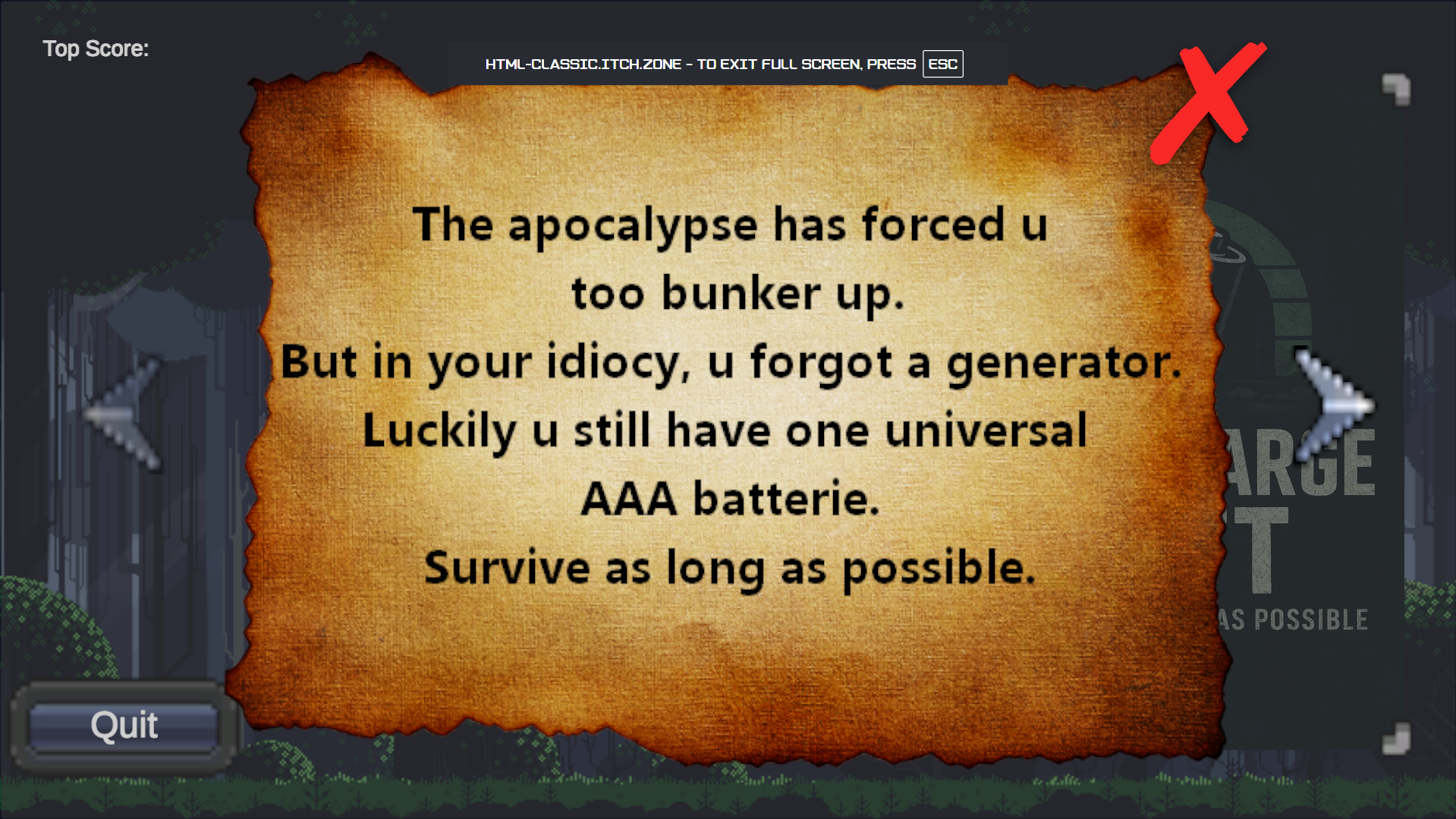 The apocalypse hit, and you wisely decided to bunker up, smart move! But in a classic brain fart, you forgot the generator. Don’t panic! You’ve got one universal AAA battery left. Yep, just one. Now, channel your inner MacGyver and survive as long as humanly possible... or until that battery finally gives up.
